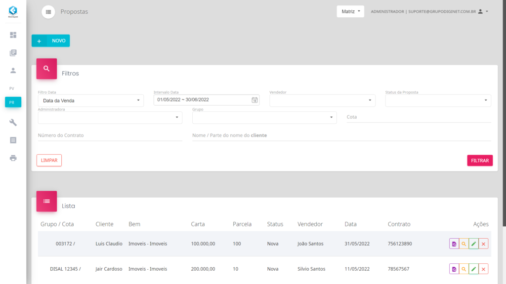Cadastra várias administradoras diferentes, com respectivas regras de comissões; - Módulo Pós Venda, para acompanhar os clientes e avaliar os vendedores em cada proposta cadastrada;